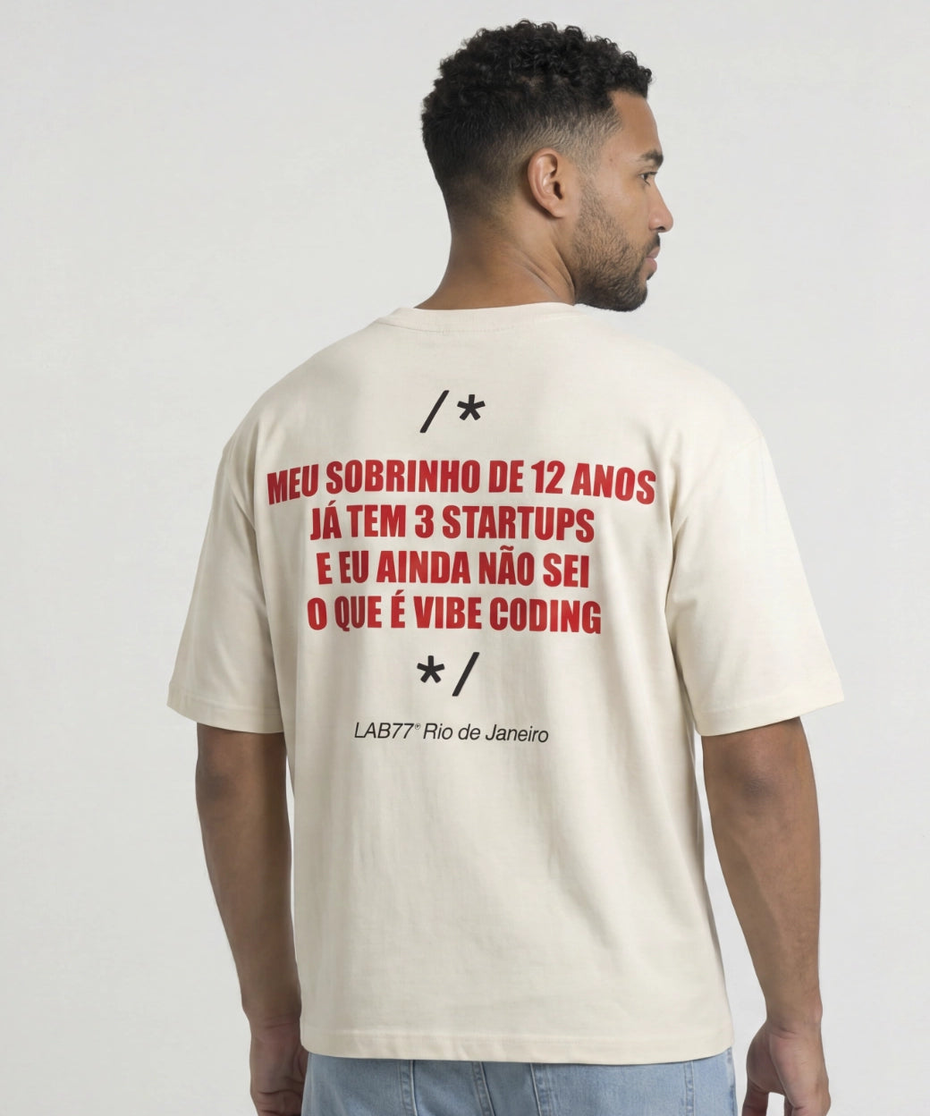 Nada na Lab77 é de origem animal. Todas as nossas camisetas são amaciadas com cascas de arroz, evitando o uso de derivados da amônia que são provenientes das vacas e dos cavalos.