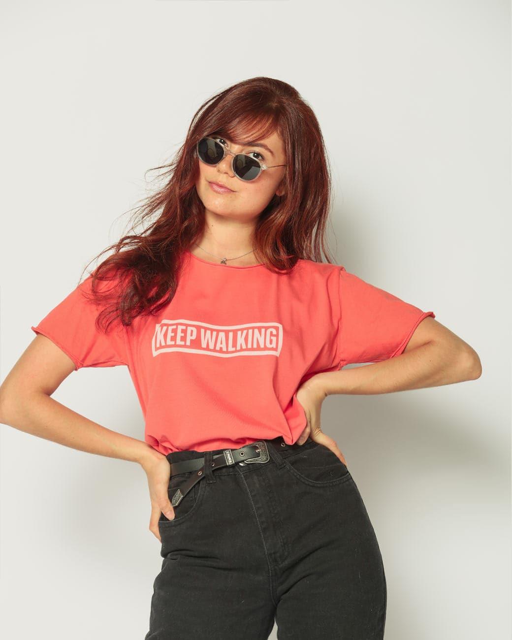 Camiseta Keep Walking Red. Sua modelagem Relax Vermelha unissex tem a gola e as mangas cortadas a fio. A cor da camiseta é vermelha clara com gramatura mais robusta garantindo maior resistência a peça. Ela é mais soltinha para as mulheres e passa por um processo de lavagem que confere a peça um toque diferenciado, maciez extrema, além de não encolher no processo de lavagem. A malha é 100% Algodão Nacional sustentável, certificada pelo selo BCI (better cotton initiative) que atua na conscientização das responsabilidades sócio ambientais no campo.