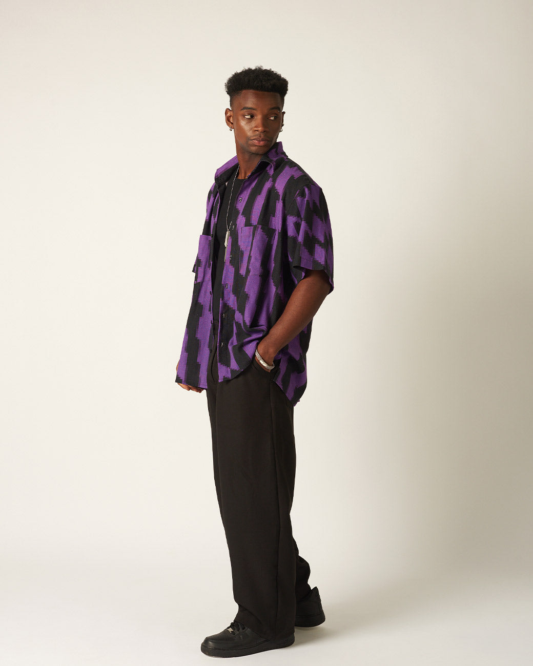 Camisa Oversized Pixel Roxa. Sua modelagem é mais quadrada, alinhado ao Rústico do linho junto com o design da nossa estampa pixelada. A gramatura da camisa é pesada trazem a fluidez na peça mas ao mesmo tempo possui porosidade suficiente para a respiração em dias quentes.