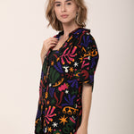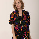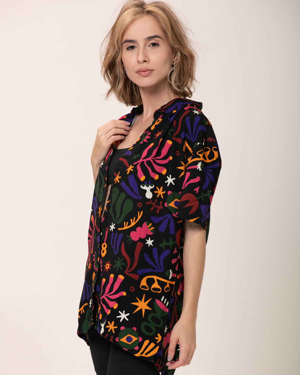 Camisa Samba Raiz com a a estampa corrida assinada pela artista Amanda Lobos (@maisdeumlobo) em celebração a força, talento e resiliência das mulheres na música brasileira.