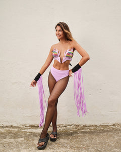 Armadura Lilás Arco-íris é uma peça exclusiva, com produção limitada a apenas 25 unidades, a parte da frente que traz o formato do fogo é feita com pedras de strass formando as cores do Arco-íris.