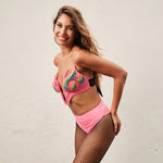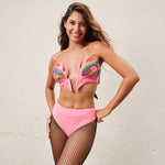 A estrutura é firme e sem alça no pescoço, deixando o visual mais aberto e valorizando o design. Separada em duas partes para facilitar o ajuste, a peça permite regulagem por meio do elástico central, que adapta o molde ao corpo, além das alças nas costas, que garantem o encaixe ideal.