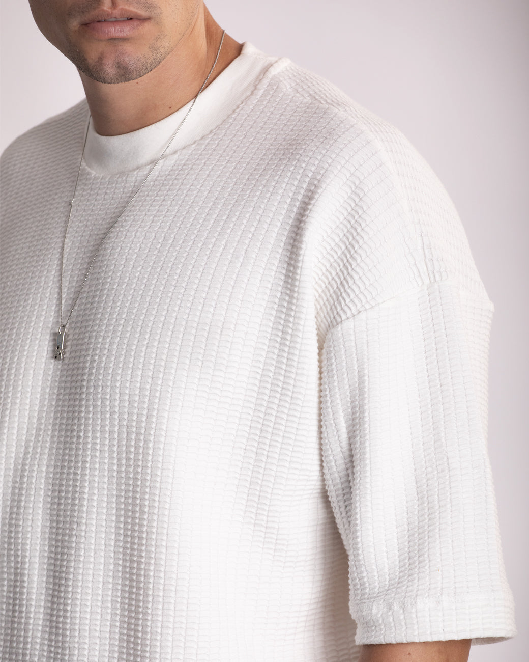 A Camiseta Aleska é feita em 100% algodão, com uma trama única em formato de pequenos quadrados que evocam a fluidez do oceano.