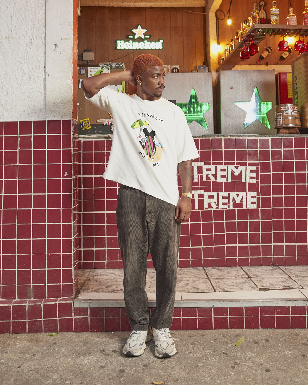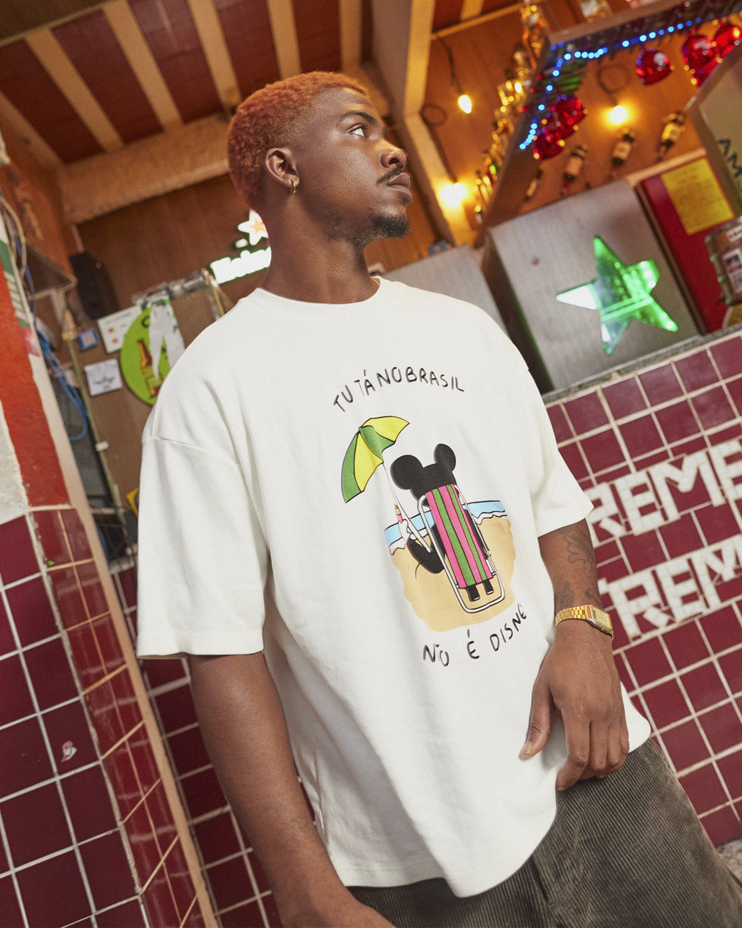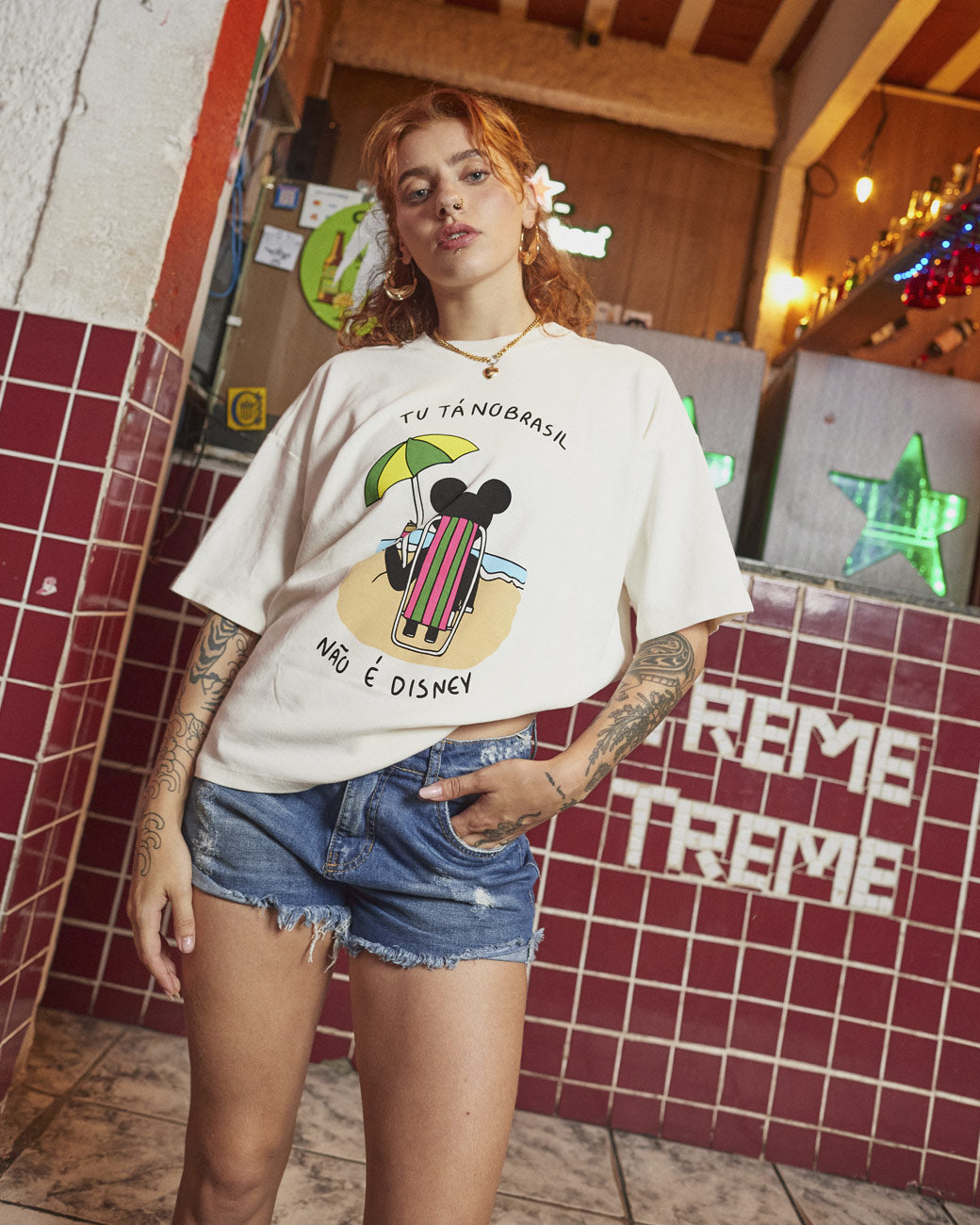 A CAMISETA TU TÁ NO BRASIL conta com um design moderno e confortável. Apresenta um comprimento ligeiramente mais curto, tórax mais largo e ombros levemente caídos. A gola, com 3 cm de ribana, é levemente fechada, proporcionando um acabamento diferenciado.
